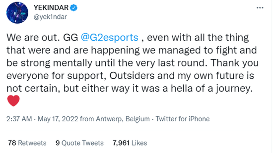 我们出局了。即使发生了这一切,我们依然努力奋战,保持坚强,直到最后一刻。感谢大家的支持,VP阵容和我自己的未来处于未知,但无论如何,这都是一段很棒的旅程。