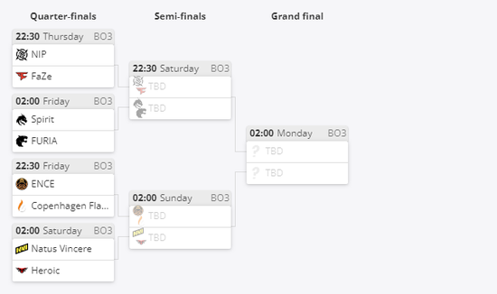淘汰赛首日第一场NIP将迎战FaZe,随后是Spirit迎战FURIA。5月20晚22:30,ENCE对阵Copenhagen Flames,随后是NaVi对阵老对手Heroic。随着越来越多的队伍离开比赛舞台,竞争将更加激烈,让我们一起期待各支队伍在有观众的场馆内的表现吧!