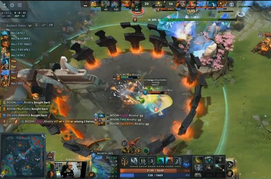 42分钟OG开雾,混沌骑士开大直接秒掉了凤凰,凤凰又是不能开出大招,随后混沌骑士和大圣一换一,火猫伐木机接管残局,BOOM玛尔斯紫猫再阵亡倒下, 随后伐木机和风行推掉了中路高地,之后45分钟双方又是一波团战,凤凰蛋虽然落地但是OG第一时间没死人,火猫拉扯,风行风步加上骨法虚无,释放了第一波大招过后的BOOM残局打不过小技能众多的OG众人,最终凤凰玛尔斯大圣电炎绝手四人阵亡倒下。