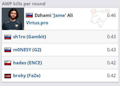 VP在本次赛事跻身淘汰赛,发挥可圈可点。其中Jame总共打出111个大狙击杀,平均每局0.46个大狙人头,是波兰白熊的可靠火力点。