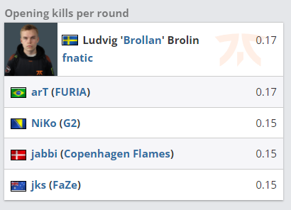 fnatic虽然未能打入淘汰赛,但他们首场也曾击败亚军G2,爆出冷门。宝蓝的OpK Rating为1.35,平均每局都能拿到0.17首杀,冲劲十足。