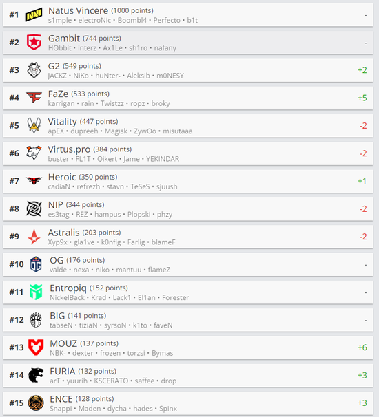 Top10中最亮眼的无疑是在Spodek竞技场上演决赛的双方。冠军FaZe凭借他们的神奇发挥从第九升至第四,这是大表哥的队伍五个月以来首次回归Top5!G2虽位居次席,但也足以让他们超过Vitality和VP,来到第三。进入半决赛的Heroic升至第七。