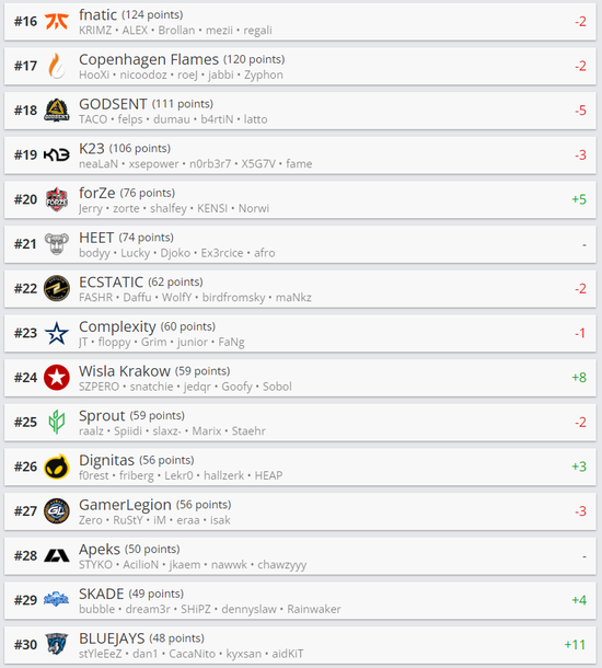 此外,Wisla Krakow、Dignitas、SKADE和BLUEJAYS皆有排名的上升。