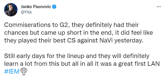 “向G2表示‘哀悼’,他们完全有机会取胜,却最终失利。他们似乎在与NaVi的比赛中发挥出了最佳水准。如今团队还很年轻 ,选手们必将从中汲取到宝贵的经验。总的来说,这是一次伟大的线下首秀。”