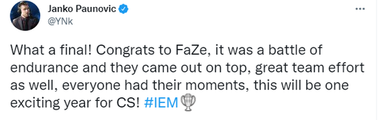 “多么精彩的决赛啊!祝贺FaZe的选手们——这是一场持久战,而他们成功夺冠。整个团队齐心协力,每个人都有发光发热,今年将是CSGO令人兴奋的一年!”