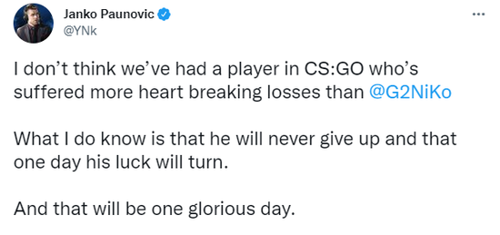 “我觉得应该没有一个CSGO选手遭遇了比NiKo更多令人心碎的失利,但我知道,他永不放弃,总有一天命运会朝他微笑的,而那将是光荣的一天。”