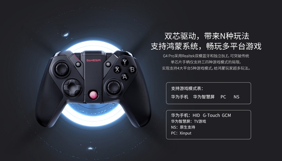 本次在华为商城上架的盖世小鸡G4pro手柄,一如既往的全能,双芯驱动,带来N种玩法。盖世小鸡G4pro支持4大平台5种游戏模式:华为手机、华为智慧屏、NS、PC均支持!