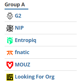 A组有G2、NIP、Entropiq、fnatic、MOUZ和Looking for org。