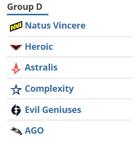 D组由NaVi、Heroic、Astarlis、coL、EG和AGO组成。