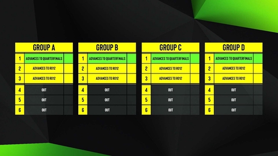 24支队伍分为4个小组,进行BO3单循环较量。依据积分小组前三进入淘汰赛段,头名进入四分之一决赛,小组第二、第三则进入淘汰赛首轮。