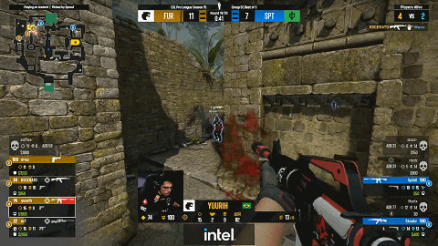 次局又是艺术哥单骑先取首杀,黑豹顺势再下一分。半起的Sprout也用上了小套路,到处双架拿到人数优势,关键时刻又是艺术哥arT的一波灵性混烟,绕至敌后,双杀致胜!此后几局艺术哥更是首杀拿到手软,RWS直接拉满,进攻双狙,arT的前压狙视角更是惊心动魄,作用拉满。半场最终局,arT甚至起出了连狙!走到拱门烟下一顿鸣枪示警,抱团打B阶段Sprout一波包点双人三杀串烧打了FURIA一个措手不及。半场比分来到9-6,黑豹暂时领先。
