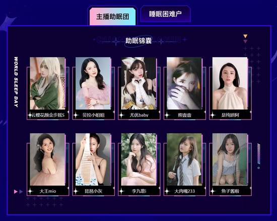 值得一提的是,在主会场之外,斗鱼其他多个直播间内也在同时进行不同方式的“劝睡疗法”,来自平台的“哄睡高手”大肉嘎233、贝拉小姐姐、大王mio、李九歌i、琵琶小灰、是纯妍阿、熊壹壹、尤优Baby、鱼子酱啦、云樱花颜金步摇s等主播组成“主播助眠团”,纷纷利用自身才艺花式整活,通过温柔的睡前故事、轻柔动听的歌声、优美的琵琶曲以及舒缓的睡前瑜伽等方式,帮助广大水友缓解身心压力、轻松入眠。