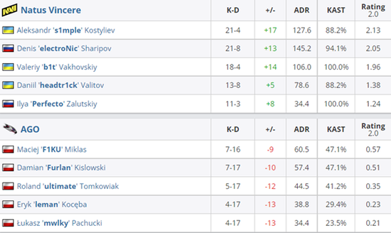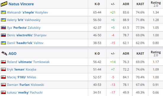 EPL S15小组赛D组:NaVi对阵AGO。图一Dust2,NaVi展示了CT端的统治力,AGO上半场仅拿到一分。来到Mirage画风突变,CT开始的AGO开局打出7-0高潮,但NaVi及时调整最终上半场拿到7分。易边后AGO的快攻不断奏效,NaVi极强的个人能力总能挽回劣势,双方大战71回合,最终NaVi以突出的个人能力略胜一筹。