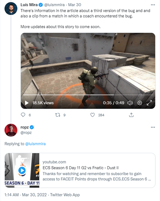 而曾经研发出像素烟的“列文虎克选手”ropz在下面跟推,提示这场可能是北京时间2018年10月19日凌晨1点ECS S6中G2与fnatic的比赛。点击ropz的跟推,你会发现他已经帮你直接定位到了可能片段,当时操作MP5-SD的选手是kennyS。该图最终由fnatic取胜。