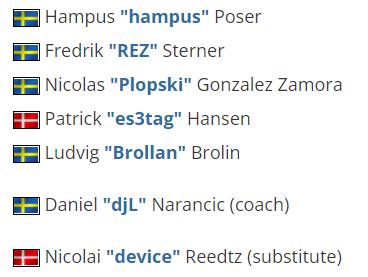瑞典方面,在引进了Brollan之后,他们提交了一个以Brollan代替phzy的核心阵容,device自从去年年底就没有参加比赛,他被列为队伍的替补,这可以视作丹麦狙击手可能在RMR回归的可能。
