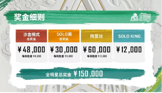 沙盒模式的奖金共48000元,每局胜者为8000元;SOLO模式则总奖金为30000元,每局胜者为5000元;阵营战模式为60000元,每局胜者为12000;获得SOLO KING称号的选手则可收获12000元的奖金。
