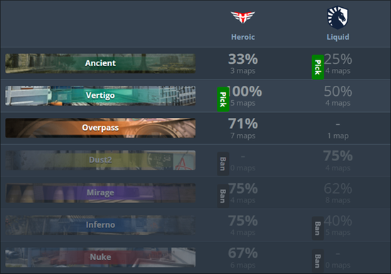 TeSeS的一波五杀打出了气势拿到两分,但后点防守加上主动出击的互相转换让Liquid拿到三分将比分提到3-7。再次将节奏抓到自己手里后Liquid连续拿分,终于在控图爆弹进攻A区成功后Heroic艰难拿分。上半场最后一回合Heroic夹B被Liquid的前压瓦解,逐个击破Heroic队员后Liquid锁定4-11比分。