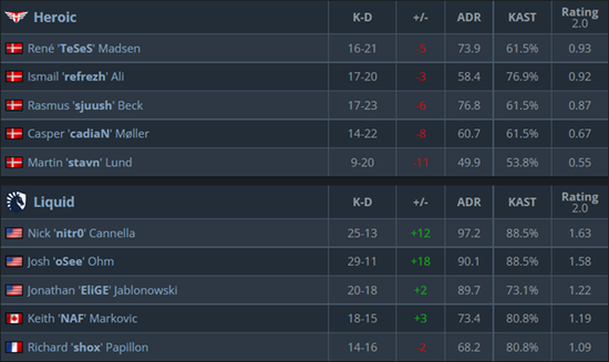 极限翻盘手枪局让Heroic打出手感,有惊无险连续拿下了四分,反观Liquid则是因为枪械劣势及残局处理不当开局不顺,而在NAF断住回防转攻B区成功后来到关键局,控住中路拿到首杀后Liquid靠着nitr0的大胆前压双杀释放压力赢下残局。
