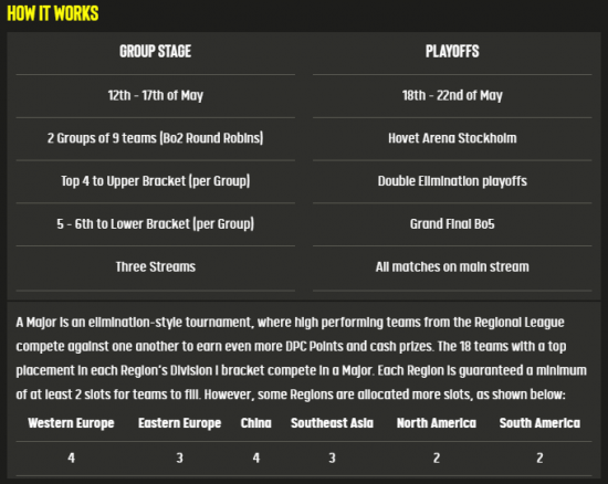 季后赛阶段则继续按照之前的双败淘汰赛进行。斯德哥尔摩Major小组赛定于5月12日至17日举行,淘汰赛将于5月18日至22日在Hofet Arena综合中心线下举办。所有队伍争夺共计50万美元和3530点DPC积分。