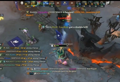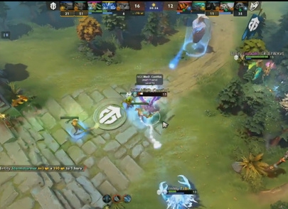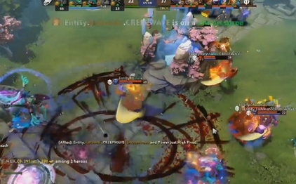 Nigma分三路带线寻找机会,Entity先将做视野的编织者击杀,再利用谜团黑洞击杀混沌骑士,扩大领先优势。卡尔反带线磨天辉下路高地,队友将拦路的编织者、天怒击杀。