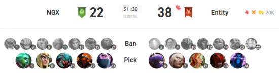 Entity在天辉方拿出美杜莎作为大核,沙王、天怒、冰魂、尸王带节奏。Nigma在夜魇方选择火猫、哈斯卡、死亡先知三核,亚巴顿、海民辅助。