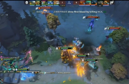 开局海民在天辉野区被Entity五人包围,滚雪球没能自救,尸王对其完成击杀,获得一血。2分钟,哈斯卡和天怒对拼,可惜没能完成反杀,哈斯卡阵亡。4分钟,天怒法师再次溜哈斯卡并完成击杀。
