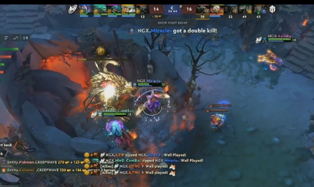 26分钟,Nigma打肉山,混沌骑士在外面开视野吃了祸乱之源大招和卡尔一套爆发。死亡先知开启BKB先手追着谜团走,谜团被杀后买活过来拉大招输出圣堂刺客,死亡先知及时击杀BKB谜团,让圣堂刺客成功反打。圣堂刺客收割成功,将Entity打了一波四人团灭,控下了二代肉山,Nigma经济一下子领先达到7K。
