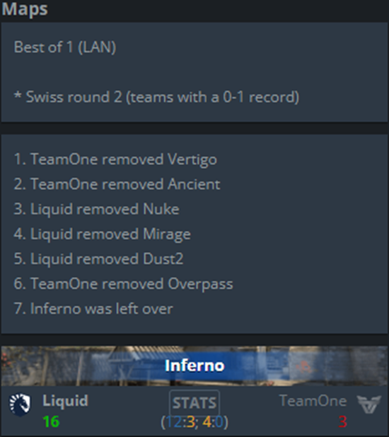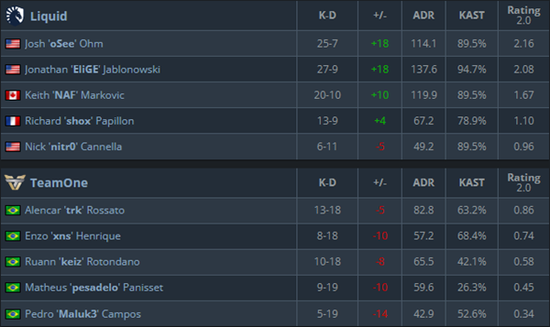 PGL RMR美洲区,Liquid对阵TeamOne,北美大哥Liquid今日靠着分别斩获2.16、2.08 rating的oSee和EliGE两员大将,帮助队伍在Inferno的防守端构建出铜墙铁壁,适时的前压和稳固的防守让Liquid轻松以16-3的比分碾压了TeamOne。