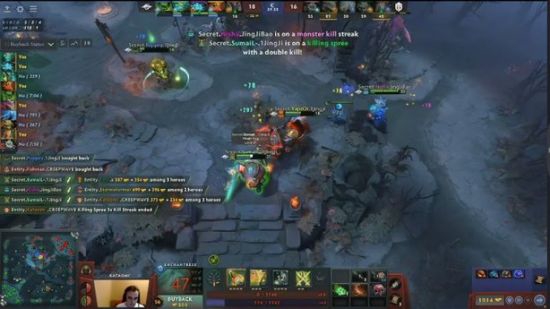 随后Secret打肉山,但是没想到肉山残血之时,Entity沙王跳刀穿刺,白牛也是冲了进来,猴子被控的动弹不得,沙王直接抢盾,白牛抢下奶酪A杖,Secret上演了究极打工,光法毒龙随后也阵亡,其余众人撤走。