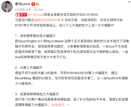 4月18日,一加手机公布新品一加 Ace将搭载独家定制的天玑8100-MAX芯片,在游戏性能、AI计算能力、夜景拍摄迎来突破。