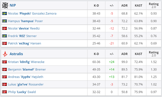 已经2-0的NIP进入BO3对局,于是他们开始碰到一些变态对手——没错,就是NaVi和Gambit。这两场比赛,device都不是队中最亮眼的那位,队伍在硬实力的差距下落败。2-2后,瑞典人终于要与另一支丹麦队伍——CPH Flames争抢出线席位。整场比赛,hampus是最关键的一员,他的灵性战术加上出色枪法让队伍让一追二,进入淘汰赛段。很遗憾,淘汰赛首轮他们碰到了亚军G2。