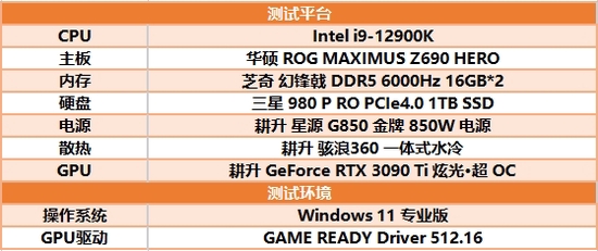 正式进入测试环节,本次测试平台处理器采用英特尔酷睿i9-12900K搭配ROG MAXIMUS Z690 HERO主板,CPU在游戏时间睿频至5.0GHz左右;内存采用芝奇 幻锋戟 DDR5 6000Hz 16GB*2;固态采用的是PCIe4.0固态,性能比PCIe3.0的固态读写速度更快;这套配置足以让耕升 GeForce RTX 3090 Ti 炫光·超 OC GPU稳定发挥出其应有的超强性能!