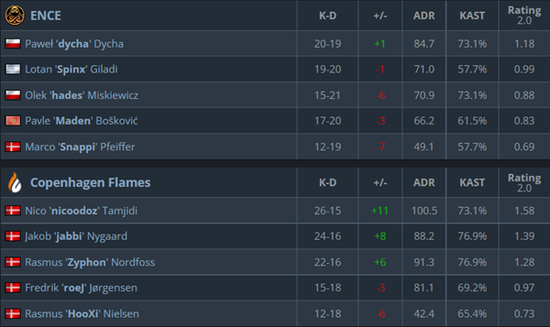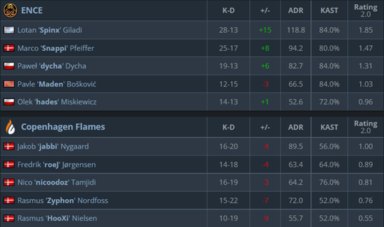 关键长枪局Zyphon三杀拦住A大的ENCE攻势得分,顺势瓦解ENCE中路的提速使得CPH Flames得以将ENCE打进eco连拿三分。中路强攻的Spinx先拿三杀锁定胜局,又在中厅断住CPH Flames剩余两人砍下四杀,关键局双方在中路激烈互换,可没注意到A大攻势的CPH Flames错过ENCE双人组丢掉赛点,最终ENCE一鼓作气拿下没钱的CPH Flames获得首胜。