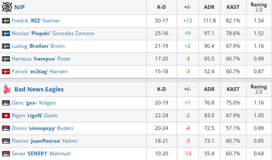 下半场手枪局NIP默认等来香蕉道前压,取得人数优势的睡衣忍者提B拿下手枪局。来到长枪局rigoN中路前压一换二,队友完成补枪,BNE拿到13分。然而BNE的噩梦才刚刚开始,NIP复刻上半场BNE进攻,Brollan,REZ与Plopski三人犹如尖利刀锋插入CT喉咙,连拿7分反超比分。经济崩塌的CT送出赛点。最终局关键先生rigoN阻杀连接的NIP将比赛拖入加时。加时赛双方针尖对麦芒,NIP有抱团火力,BNE激进前压反制。换边后BNE出其不意飞二楼却被NIP完美防御,睡衣忍者再拿赛点。BNE可圈可点的藏烟闪追回一个赛点。第六局BNE未能突破B区防线,惜败NIP。