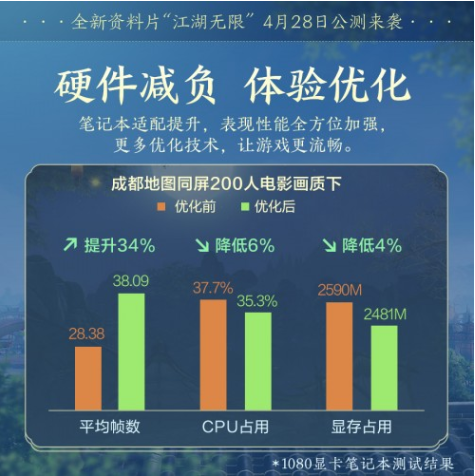 笔记本优化系统今日上线!从六大方面进行优化,不会影响实际表现情况,也不会出现越优化画质越差的问题。测试数据显示,各配置笔记本在优化后平均帧率均有提升。而在秘境内,影响卡顿问题的逻辑帧高耗时也有26.63%的改善优化。
