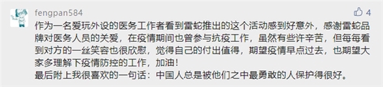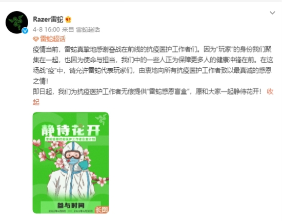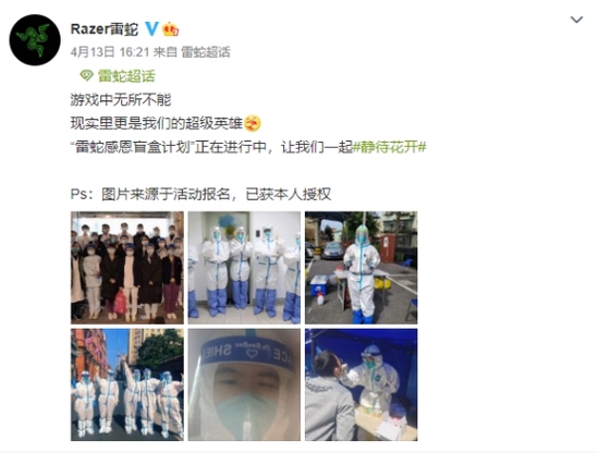 除了游戏厂商,“灯厂”雷蛇的中国区分部也位于上海,4月8日,雷蛇在社交平台上宣布为感谢奋战在前线的抗疫医护工作者们,即日起,雷蛇为抗疫医护工作者无偿提供“雷蛇感恩盲盒”。
