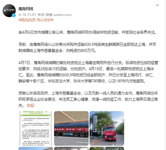 作为全国的经济中心,上海聚集国内许多的游戏行业的从业者,随着上海市每日确诊数量的激增,各行各业也都开始向上海伸出援手。比如因《明日方舟》而为大家所熟知的鹰角网络,就在4月8日,从山东寿光采购了600吨蔬菜物资捐赠给上海地方公益组织。