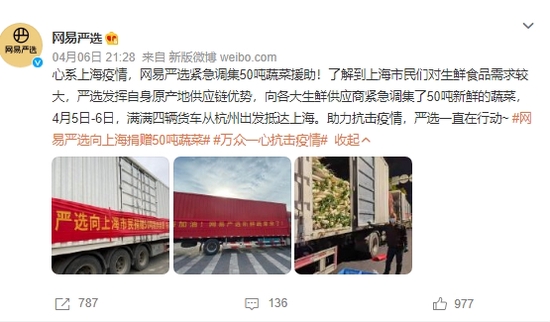国内TOP2的猪厂网易,也在4月6日宣布捐赠50吨蔬菜援助,并在15日开通了网易严选上海保供团购官方通道。