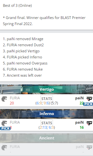 BLAST showdown NA决赛:FURIA对阵paiN,图一双方展现必胜决心,难解难分。进入加时赛后的paiN火力全开,biguzera与NEKIZ双突破不断攻破FURIA防线,paiN先拿一图。延续Vertigo火热手感的paiN,防守端交出13分的满意答卷。来到下半场FURIA虽然连追六分,但调整过后的paiN一鼓作气击败FURIA晋级春季决赛。