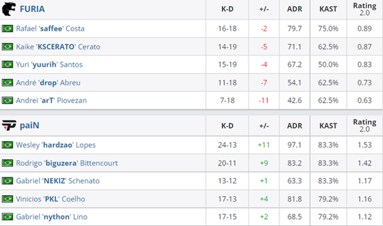 下半场手枪局黑豹扑向中路,枪法撕裂CT防线拿下手枪局。来到长枪局FURIA对中路控制欲过强,CT抓timing反清歼灭土匪。暂停调整后的黑豹突然A区提速彻底打乱paiN防守节奏, 然而CT并未就此萎靡,凭借超高的残局胜率挽回劣势。当艺术进攻碰撞残局之王,比赛十分胶着。最终局黑豹中路出击,saffee单人突破B区,比赛进入加时。加时赛双方依旧难解难分,来到第二个加时赛的paiN火力全开,biguzera与NEKIZ扛起队伍大旗,多次拯救队伍,最终22-20击败FURIA。