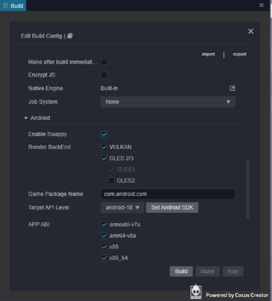 作为广受全球开发者青睐的数字内容生产引擎,Android平台上一直存在着大量由 Cocos 制作的内容,Cocos 也一直与 Google 保持着紧密的合作关系。在此次更新中,Cocos 正式添加了对Google Frame Pacing Library技术的支持,其主要用于帮助游戏平滑和稳定帧率。该功能可以在编辑器的 Android 构建面板中一键开启。