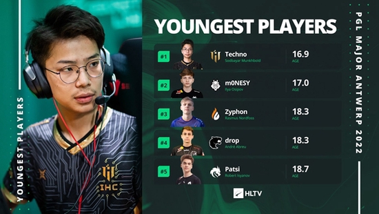 HLTV还发布了最年轻参赛选手的排名,IHC的Techno年仅16.9岁便参加了这项CSGO领域最顶尖赛事。m0NESY(17.0岁)、Zyphon(18.3岁)、drop(18.3岁)和Patsi(18.7岁)榜上有名。