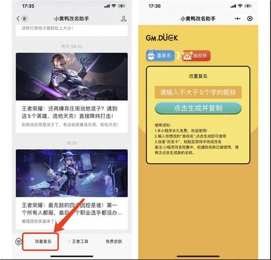 点击公众号“小黄鸭改名助手”左侧菜单栏“改重复名”,即可打开小黄鸭改名助手小程序,然后输入想起的名字,点击生成并复制;