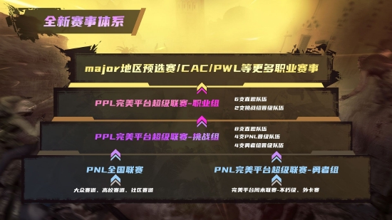 每届PPL分为勇者组、挑战组、职业组三个阶段。玩家可自组战队,通过参与完美平台周末联赛或勇者组外卡赛,获得进入勇者组的资格。从勇者组脱颖而出的4支队伍将与8支直邀职业队以及4支PNL(完美世界CS:GO全国联赛)晋级队伍共同组成挑战组。因此,玩家也可通过参与PNL直接争夺挑战组的资格,点击查看PNL赛事详情:https://pnl.pwesports.cn/