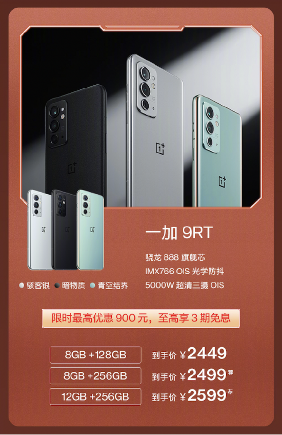 一加9RT搭载骁龙888旗舰芯,满血版 65T 超级闪充,5000W 超清三摄 OIS,性能满血,全面加料,产品最高优惠900元,2449元即可到手。