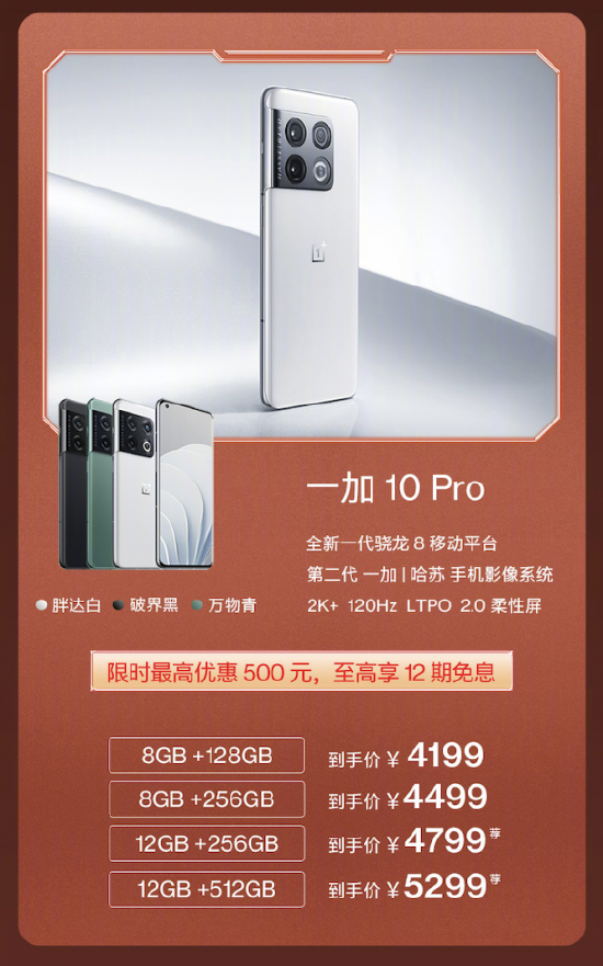 性能、游戏、充电、屏幕等全面拉满的第十代性能旗舰一加 10 Pro,搭载骁龙8旗舰芯,第二代一加 | 哈苏 手机影像系统,2K+120Hz LTPO 2.0 柔性屏,全系产品劲爆直降,限时最高优惠500元,更可享长达12个月的免息优惠,到手价4199元起。