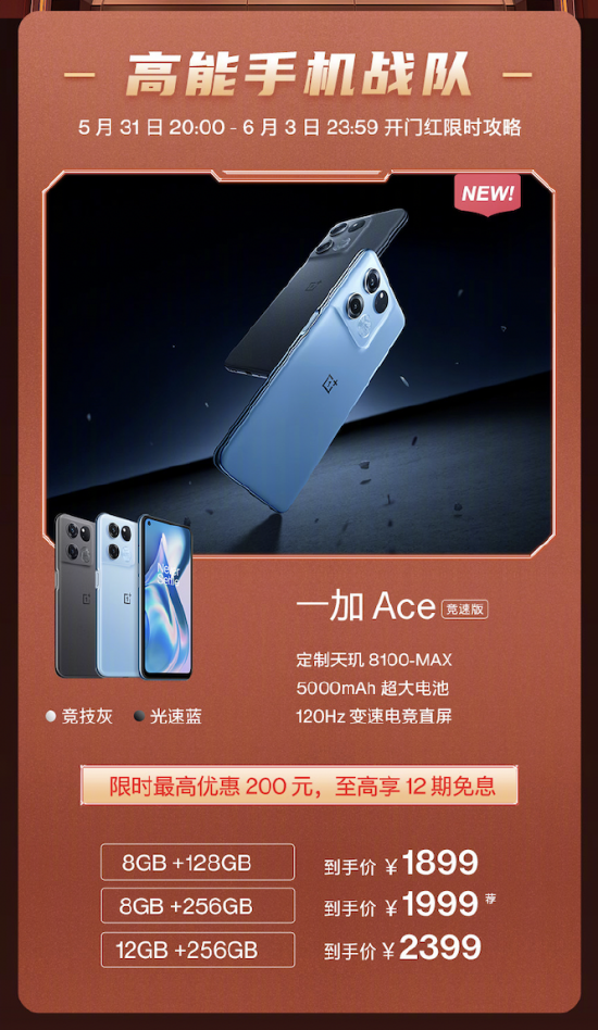 5月31日晚8点,一加Ace竞速版高能开售,到手价1899元起。除Ace竞速版外,618活动期间购买一加产品可享受限时福利价,一加 Ace低至2499元起,一加 10 Pro低至4199元起,一加 9RT低至2449元起,IoT产品全线直降低至169元起。购买还可享受免息分期、至6月30日的超长周期价保等福利。同时,用户还可参与一加“百场5折福利“、直播抽百台手机大奖”、“一加锦鲤全家桶”等惊喜活动。