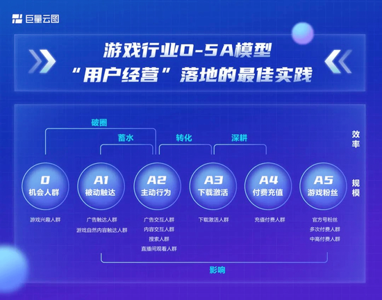 而游戏玩家的决策链路会更短,并且其付费一般都基于持续的良好体验,并不是“一锤子买卖”,所以通常每个环节都要照顾到。因此巨量引擎针对游戏玩家这样定义5A:A1-被动曝光、先让用户知晓;A2-用户开始感兴趣、产生主动行为;A3-用户下载、激活;A4-用户进行付费、转化等更深层的行为;A5-用户多次付费、成为游戏的粉丝。