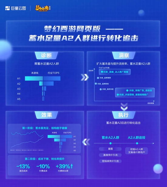 在第一阶段通过O5A模型诊断后,巨量引擎发现这款游戏整体的5A量级基础不错,但相比行业Top产品,它的A2量级明显不足,这也导致其后续转化动力不足,所以他们将核心目标锁定为蓄水A2人群、扩大基本盘;