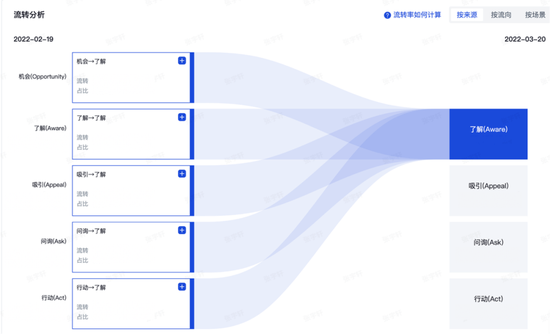 第二步是将这些数据与用户行为对应起来。比如某个用户,如果在最近七天内有过搜索品牌一次以上,或者观看直播一次以上,或者观看自然内容七次以上等行为,就会被归为A2这个感兴趣的阶段;如果付过费,则属于A4的行动阶段;如果关注了官方账号,则属于A5阶段。